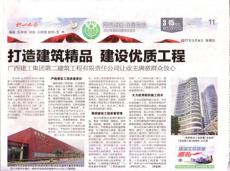 3月9日,《柳州晚报》报道公司:《打造建筑精品建设优质工程》,现全文转载:近年来,广西二建积极开拓柳州建筑市场,秉承“抓管理、建精品;美环境、保安康;重诚信、促发展”的管理方针,积极投身于柳州市城市建设事业,2017年3月9日,由建筑业联合...