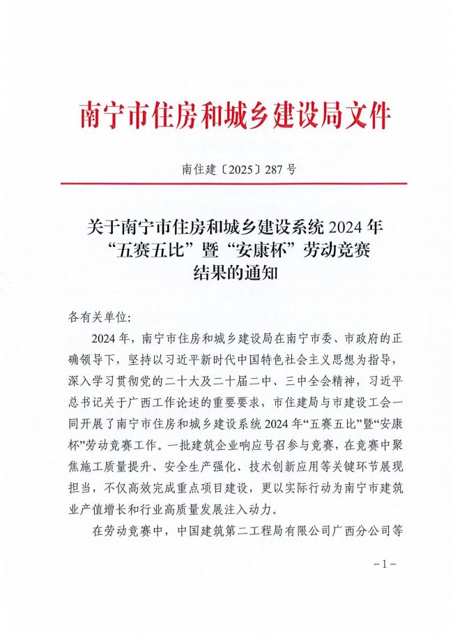 近日,南宁市住房和城乡建设局公布2024年度全市住房和城乡建设系统“五赛五比”暨“安康杯”劳动竞赛结果,对竞赛中表现优异的12家单位进行通报表彰,公司凭借优秀表现荣列榜中。此次竞赛由南宁市住房和城乡建设局联合南宁市建设工会共同举办,旨在深入...
