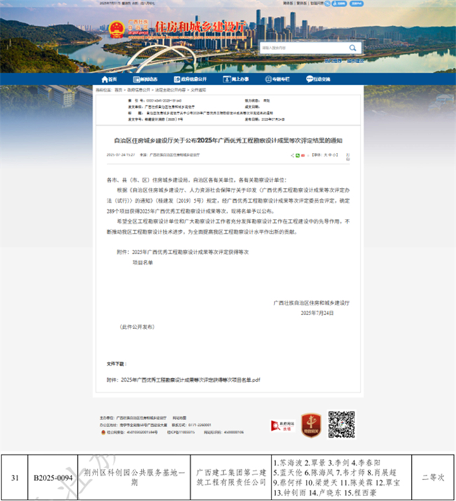 近日,自治区住建厅公布2025年度广西优秀工程勘察设计成果评选结果,广西建工集团第二建筑工程有限责任公司选送的荆州区科创园公共服务基地一期项目凭借创新设计与卓越品质荣获优秀(公共)建筑设计二等奖。获奖文件获奖项目位于湖北省荆州市,项目总建筑...