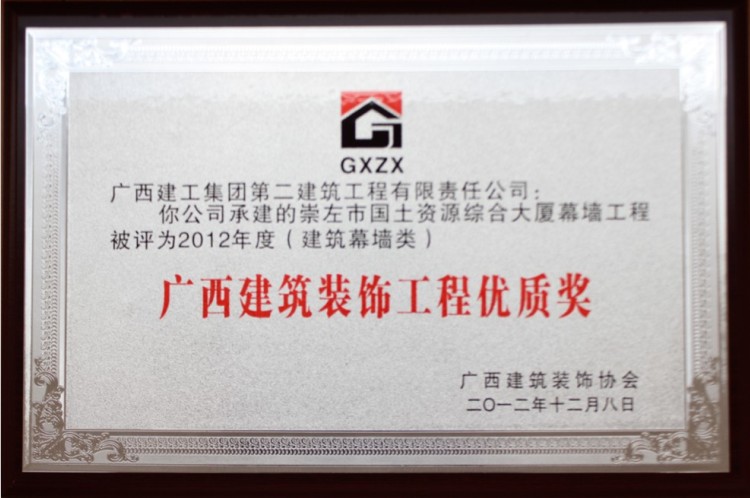 崇左市国土资源综合大厦荣获2012年度广西建筑装饰工程优质奖