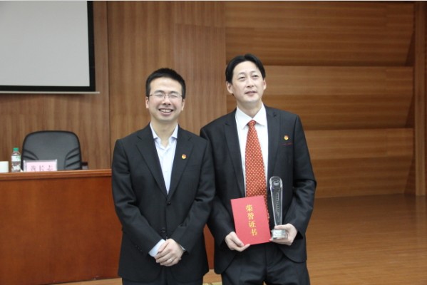 南宁团市委书记王亚楠(左)为公司团委王书记(右)颁奖并合影留念