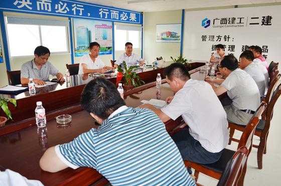 2014年06月13日 09:41李耀俊总经理一行来到建院新校区H-1学生食堂(含职工食堂)工程,G—1、G—2a学生宿舍楼工程,A-2教学楼(含多功能厅)工程,总交、地下管线、体育场(含看台)工程,对现场文明、质量安全、抢工措施等情况进行详细了解。广西建设职业技术学院新校区项目作为三分公司2014年度“安康杯”参赛项目,工期迫在眉睫。