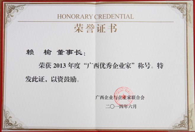 公司获评广西优秀企业 赖榆董事长获广西优秀企业家荣誉