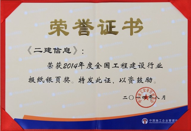 全国工程建设行业报纸银页奖由组委会组织专家现场进行评选。经专家评定,认为《二建信息》作为企业内刊,每月出版一期,版面设计合理、美观;坚持正确的舆论导向,内容丰富,及时传递国家方针政策,反映企业生产经营动态;开辟有“二建文苑”文艺副刊,丰富了精神文化建设载体,为职工展示自我才华和表达自我情感创造了良好平台,助力和谐社会建设。