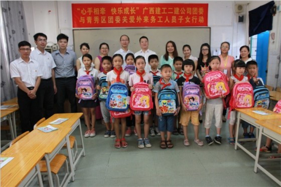 新学年伊始,为深入实施“金秋助学”送温暖工程,承担起“二建人”应有的社会责任,积极回馈社会,服务和帮助外来务工人员子女上好学,公司团委联合青秀区团委开展“心手相牵 快乐成长”关爱外来务工子女行动,为长堽小学品学兼优的贫困学生以及外来务工人员子女送去书包、文具、书籍等,为他们实现心中小小的心愿,帮助他们健康快乐成长。