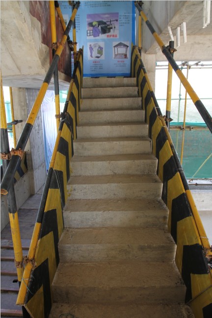 走进远通·上城项目部映入眼帘的是100多米长的企业文化宣传长廊,对公司质量管理方针、企业文化理念等进行上墙宣传。迈入作业区,现场材料用工具化防护栏杆隔离分区整齐堆放,材料标识牌清晰、明了。文明工地“四字经”等生动形象的安全生产标语和漫画,警醒项目人员时时刻刻要树立安全意识,注意安全防护;社会主义核心价值观等传统知识文化喷绘写真,让项目增添一份文化气息。临边防护严格按照公司标准化图集进行设置,采用定型化、标准化防护,楼梯防护栏杆下用废旧模板搭设了挡脚板,与水平杆、立杆一同刷黄黑相间的警示油漆。