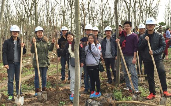 在树苗前合影留念