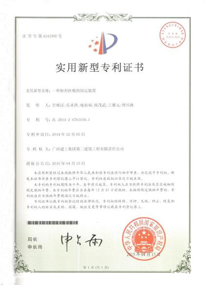 近日,由公司研制的“空调管道穿砌体外墙用的轻质混凝土预制构件”和“一种矩形柱模的固定装置”两项实用新型专利获国家知识产权局授权并颁发专利证书。这两项专利证书的获得,意味着公司在今年的专利申报上取得了好效果。