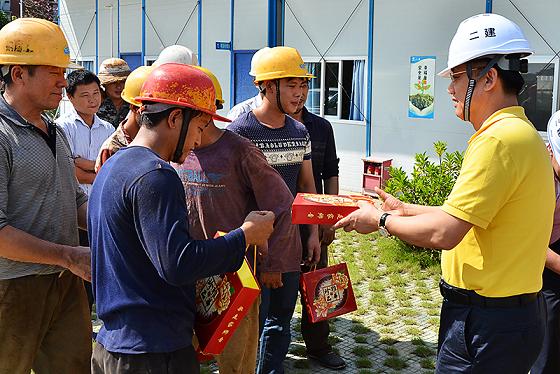 2015年09月28日 08:36中秋临近,为了让离家的农民工们也能度过一个欢乐、祥和的中秋佳节,9月25日上午,自治区建设工会慰问组一行在公司党委副书记、纪委书记、工会主席黄远奇的陪同下,来到公司广西儿童医院建设项目,慰问奋战在建设一线的工人。