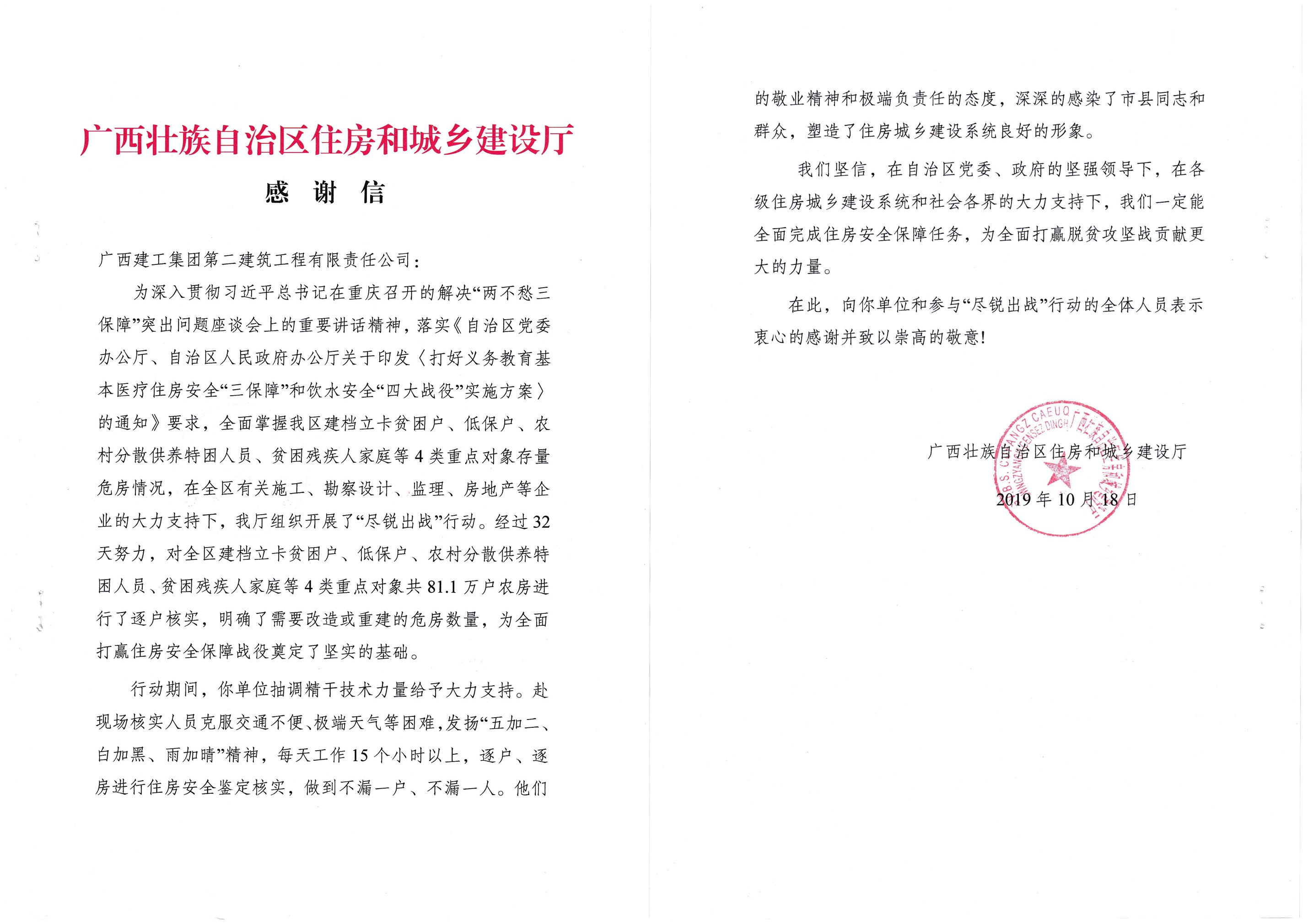 来信指出,在参与自治区住建厅组织开展的“尽锐出战”行动期间,公司负责人高度重视,派出廖雪珩等22名技术骨干克服交通不便、极端天气、家庭和工作等困难,发扬“五加二、白加黑、雨加晴”精神,每天工作15个小时以上,逐户、逐房进行住房安全鉴定核实,做到不漏一户、不漏一人。广西建工二建人的敬业精神和极端负责任的态度,深深感染了市县同志和群众,展示了住房城乡建设系统的良好形象。