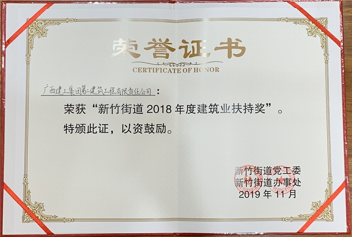 公司荣获“新竹街道2018年度建筑业扶持奖”