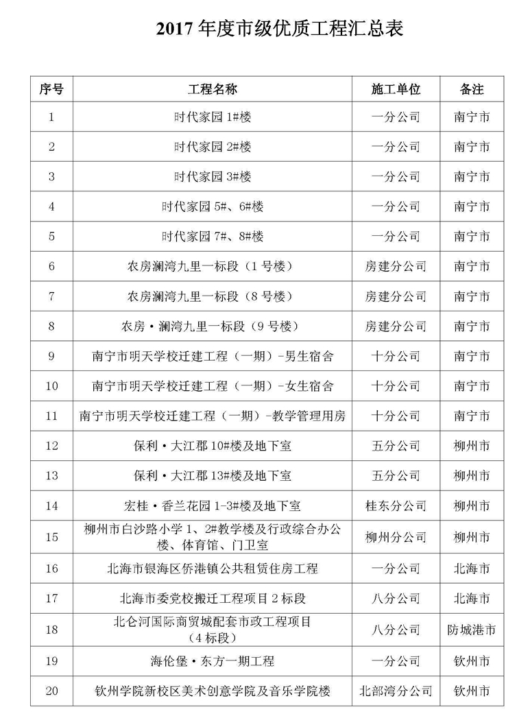近日,广西各地市2017年度市级优质工程评审陆续结束,公司在区内的南宁、柳州、北海、防城港、钦州等5个地市共获得20个市级优质工程奖。其中,第一分公司荣获7个;第十分公司、房建分公司各荣获3个;第五分公司、第八分公司各荣获2个;桂东分公司、...