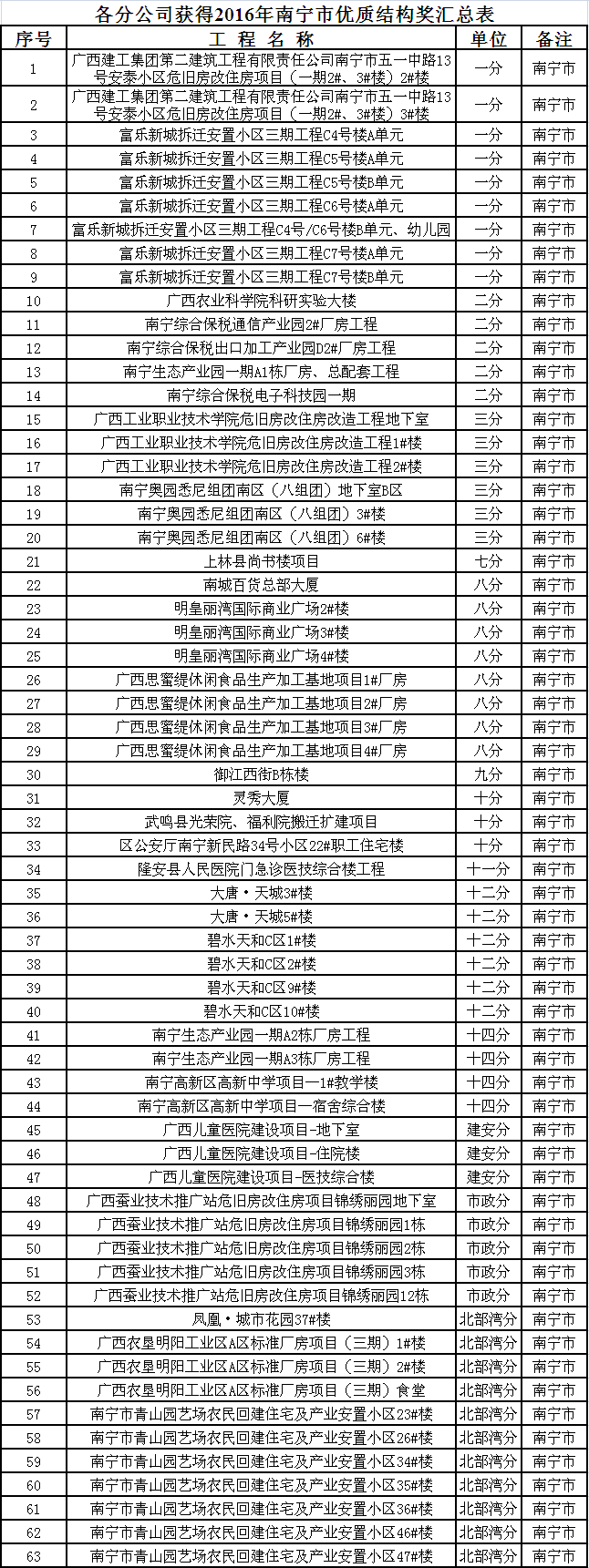 近日,南宁市建设工程质量安全管理协会发布了“关于公布南宁市2016年度建设工程质量‘优质结构奖’获奖工程名单的通知”(南建质安协[2017]1号),对评出的424个获奖工程进行了通报表彰,公司共有63个工程获奖,占获奖工程总数的14.9%,...