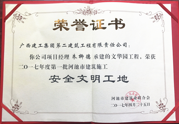 近日,从河池市建筑业联合会传来一大喜讯,房建分公司(原市政建筑分公司承建)的都安县文华园项目荣获“2017年第一批河池市建筑施工安全文明工地”称号。都安县文华园项目位于都安县屏北路,建筑面积40158.36㎡;框架结构,共4栋18层无地下室...