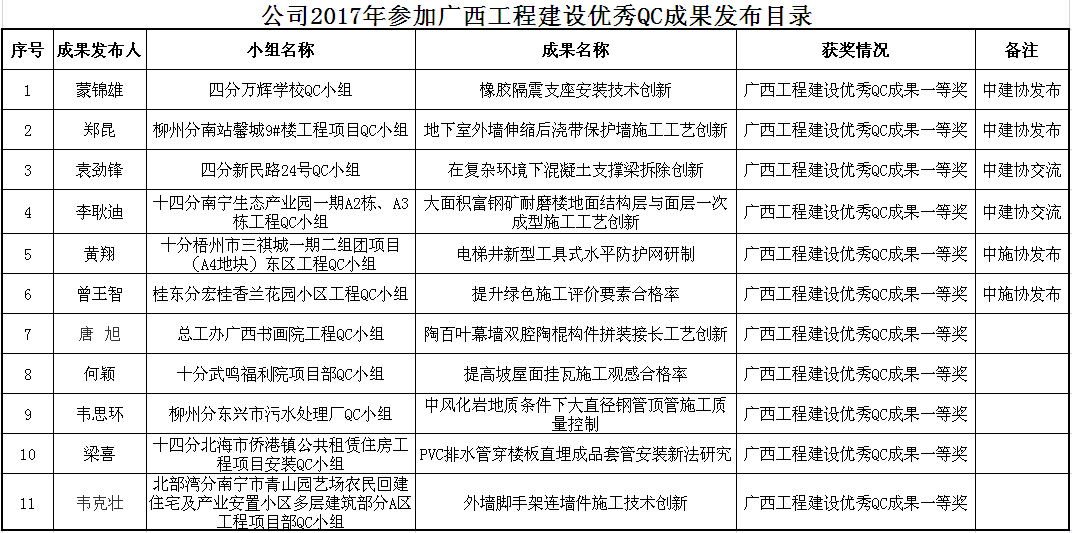 4月18-21日,由广西工程建设质量安全管理协会主办的“2017年广西工程建设优秀QC小组成果发布会”在广西防城港市隆重召开。公司共有77个成果参加评审,其中有11个成果获得一等奖,22个成果获得二等奖,37个成果获得三等奖,7个成果获得鼓...