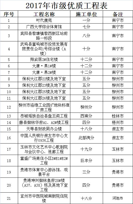 2017年广西优质工程申报工作已基本完成,广西各地市2017年的市级优质工程评审也全部结束,公司在区内的南宁、柳州、崇左、玉林、贵港、桂林、梧州、河池等8个地市共获得21个市级优质工程,获奖工程数量比去年增加7个,创公司近年来的较好水平。在...