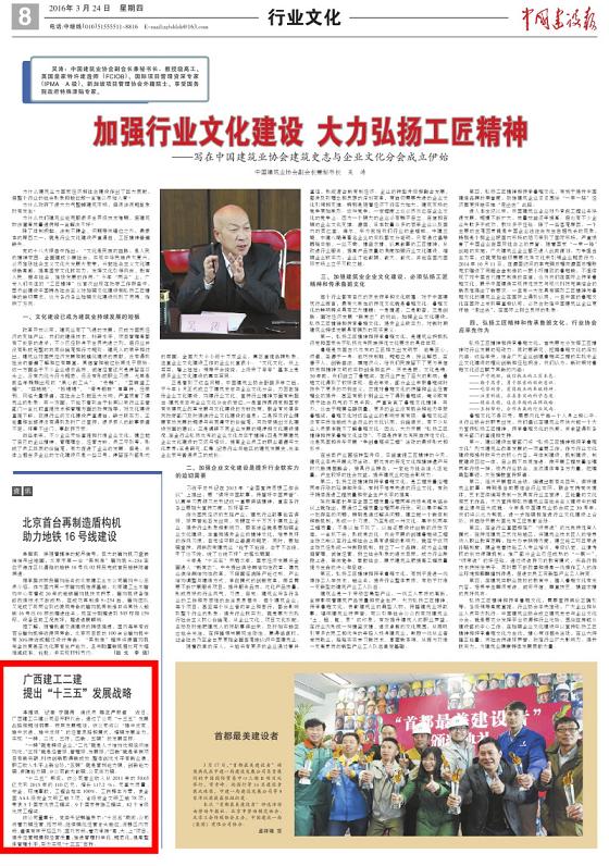 3月24日,广西日报报道公司:《广西建工二建制定“十三五”发展规划》,新华网、网易、今日头条等多家媒体转载,现全文转载:本报南宁讯(记者/莫艳萍通讯员/陈正严)广西建工二建公司“十三五”发展战略和规划纲要近日出炉,未来5年间,公司将以“稳中...