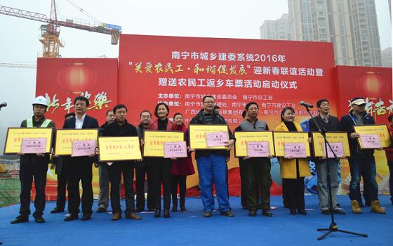 1月20日上午,南宁市城乡建委系统2016年“关爱农民工·和谐促发展”迎新春联谊活动暨赠送农民工返乡车票活动在南宁市地铁三号线2标11工区项目部隆重启动。公司党委副书记、纪委书记、工会主席黄远奇、建安分公司党支部副书记、工会主席李章宁应邀出...