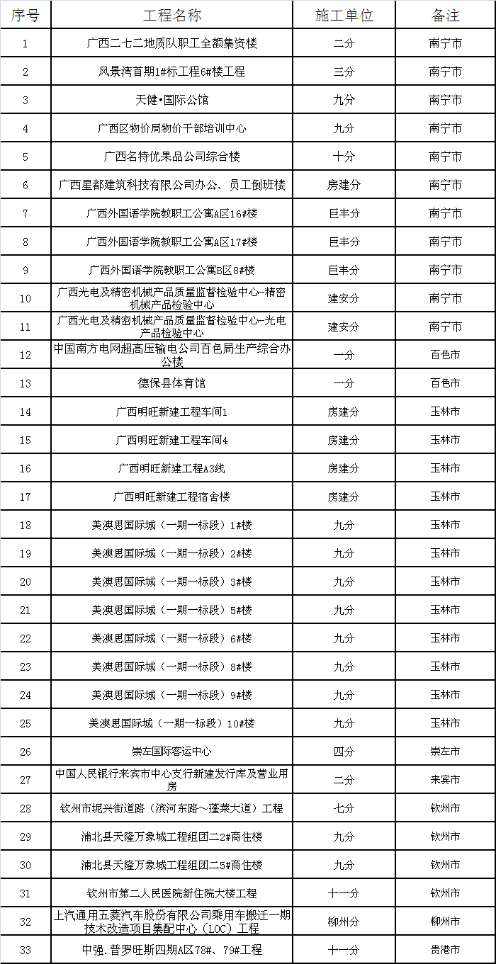 2015年广西优质工程申报及现场核查工作已基本完成,广西各地市2014年度的市级优质工程评审也全部结束,公司在区内的南宁、玉林、钦州、百色、柳州、来宾、崇左、贵港等8个地市共获得33个市级优质工程奖,获奖工程数量比去年增加8个,创公司历年来...