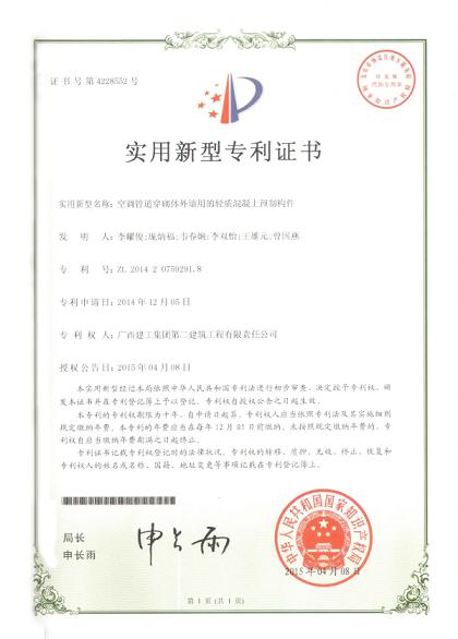 近日,由公司研制的“空调管道穿砌体外墙用的轻质混凝土预制构件”和“一种矩形柱模的固定装置”两项实用新型专利获国家知识产权局授权并颁发专利证书。这两项专利证书的获得,意味着公司在今年的专利申报上取得了好效果。截止目前,公司今年已获得的实用新型...