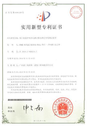 近日,由公司研制的“用于泥浆护壁冲孔灌注桩沉渣层厚度测定装置”和“浇筑卫生间墙体混凝土翻边用的模板固定工具”两项实用新型专利获得国家知识产权局授权并颁发专利证书。这两项专利于去年年底申报,经过近四个月时间即获得了国家知识产权局的认可和授权,...