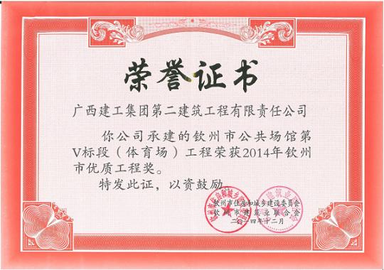近日,第七分公司承建的钦州市公共场馆第Ⅴ标段(体育场)工程和钦州市公共场馆第Ⅵ标段(体育馆、游泳馆、跳水馆、大平台)工程被评为2014年钦州市优质工程奖。钦州市公共场馆第Ⅴ标段(体育场)工程合同造价18835.68万元,建筑面积:38564...