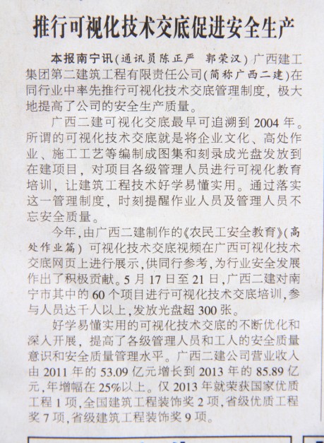 6月21日,《广西法治日报》第四版以“推行可视化技术交底促进安全生产”为题对公司开展可视化技术交底的情况进行了报道,现全文转载:本报南宁讯(通讯员陈正严郭荣汉)广西建工集团第二建筑工程有限责任公司(简称:广西二建)在同行业中率先推行可视化技...