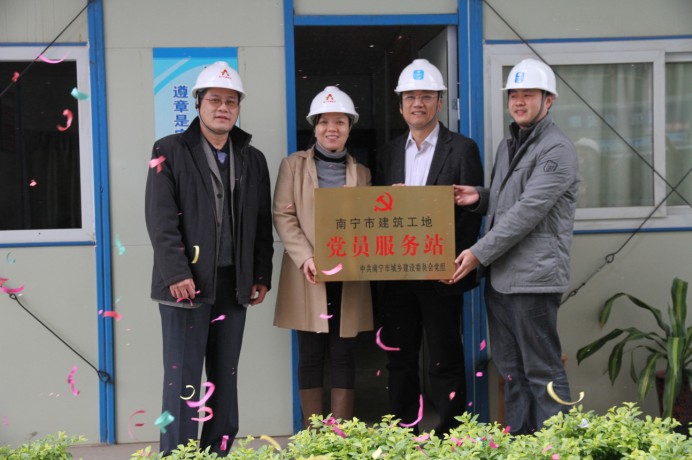 在深入学习宣传贯彻党的十八大精神之际,12月25日,南宁市建筑工地党员服务站在公司南宁市外国语学校教职工危旧房改造项目挂牌建立。南宁市建管处书记黄萍,南宁市建管处劳务站站长戚立平,南宁市西乡塘区有关负责人出席授牌仪式;公司党委副书记、纪委书...