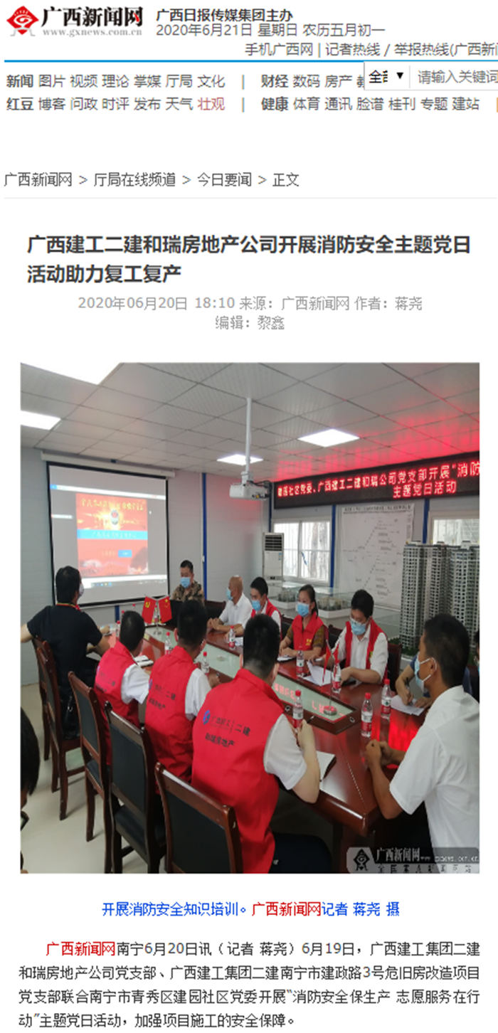 6月20日,广西新闻网发表《广西建工二建和瑞房地产公司开展消防安全主题党日活动助力复工复产》一文,以图文形式报道和瑞房地产公司开展消防安全主题党日活动,展现了公司进一步落实建筑工地疫情防控“十严格”措施,压实安全生产责任,加强项目施工安全保...