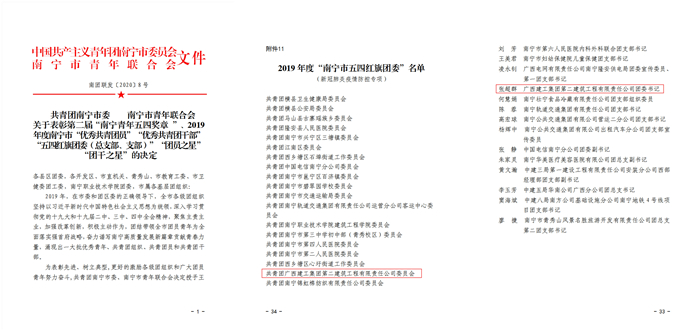 近日,从共青团南宁市委传来喜讯,公司团委获评新冠肺炎疫情防控专项“南宁市五四红旗团委”荣誉称号、张超群同志荣获新冠肺炎疫情防控专项“南宁市优秀共青团干部”荣誉称号。新型冠状病毒感染的肺炎疫情发生后,公司团委在公司党委和上级团委的正确领导和指...