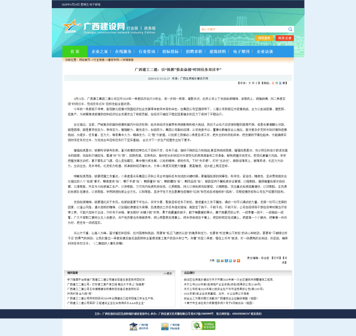4月23日,广西建设网以《广西建工二建:以“抢抓”姿态奋战“时间任务双过半”》为题,报道公司召开一季度经济运行分析会,动员公司上下发扬抢抓精神,迎难而上,顽强拼搏,奋战二季度实现“时间过半、完成任务过半”目标。文章链接:http://www...