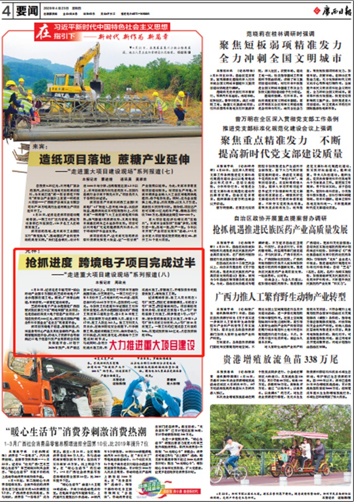 《广西日报》4月23日要闻版报道第十四分公司承建的位于凭祥市的三诺跨境电子产业示范园边境出口加工产业园一期工程项目建设情况,聚焦项目部加快复工复产和建设进度的积极举措,展示了公司积极应对疫情、助力稳经济促发展的良好社会形象。现全文转载如下:...