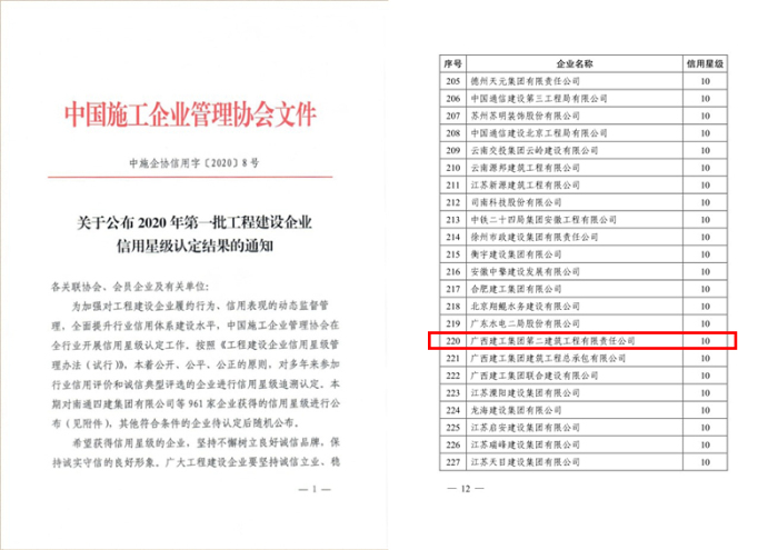 近日,中国施工企业管理协会信用评价工作委员会发布《关于公布2020年第一批工程建设企业信用星级认定结果的通知》,在全国第一批参加星级追溯认定的961家企业中,公司信用星级认定为10级。一直以来,公司始终秉承“品质源于责任、诚信创造价值”核心...