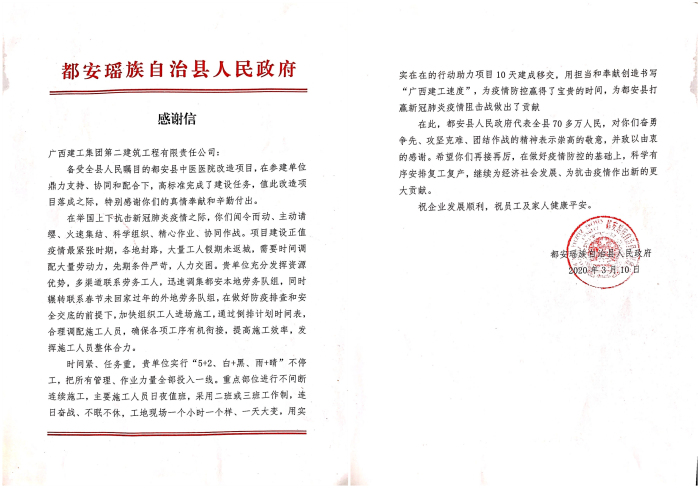3月10日,公司收到都安瑶族自治县人民政府的感谢信,感谢公司高质量高标准完成都安县中医医院改造项目建设任务。来信指出,在举国上下抗击新冠肺炎疫情之际,公司闻令而动、主动请缨建设都安县中医医院改造项目,充分发挥资源优势,克服时间紧急、资源紧缺...