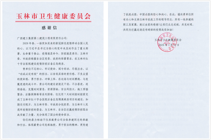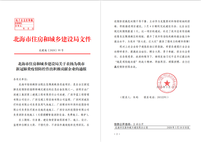 3月10日,公司收到北海市住房和城乡建设局的表扬信,来信对公司等参建单位高质高效圆满完成北海市结核病防治院应急隔离病房改造项目建设任务进行通报表扬。来信指出,公司在工期短、任务重、建设物资紧缺等困难下,顾全大局,不惜代价、不讲条件高效组织优...