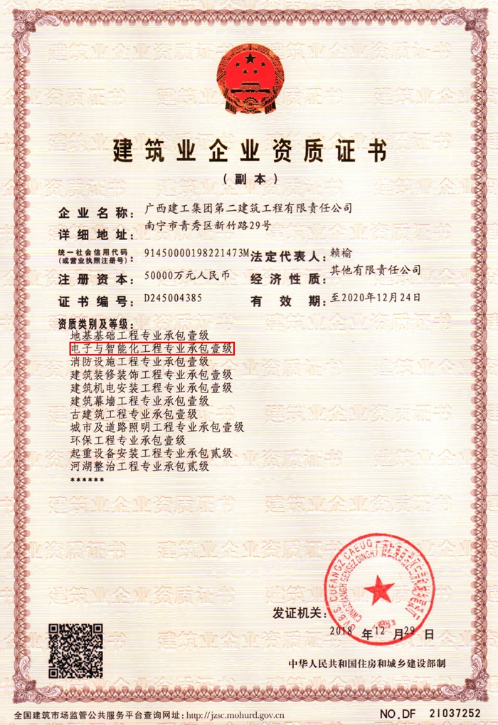 近日,公司资质申报工作再传喜讯,成功取得电子与智能化工程专业承包一级资质,进一步完善了公司资质体系。据悉,电子与智能化工程专业承包资质分为一级、二级两个级别,其中一级资质可承担各类型电子工程、建筑智能化工程施工。该项资质的取得将进一步拓展公...