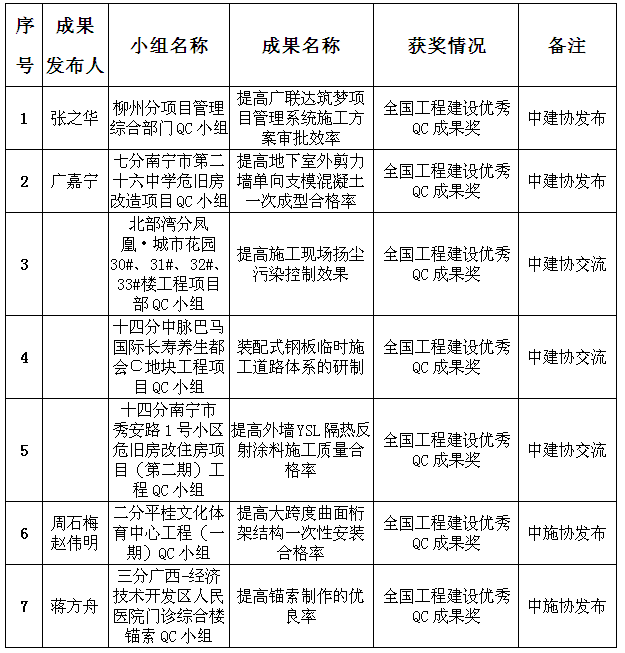 6月26日~28日,中国建筑业协会工程建设质量管理分会在江苏省扬州市召开2018年全国工程建设优秀QC小组活动成果交流会(南方会场),公司有五个成果参加发布和交流,均全部获奖。7月10日~12日,中国施工企业管理协会在福建省厦门市召开201...