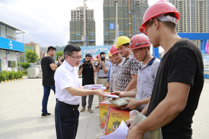 近日,贺州市人大常委会副主任、市总工会主席黄少雄率队来到第二分公司贺州市市民服务中心项目工地开展2018年“夏送清凉”慰问活动,看望慰问一线建筑工人。黄少雄向正在施工的建筑工人们表达了亲切的问候,为他们送上降暑祛热的慰问品和职工劳动权益宣传...