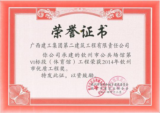 近日,第七分公司承建的钦州市公共场馆第Ⅴ标段(体育场)工程和钦州市公共场馆第Ⅵ标段(体育馆、游泳馆、跳水馆、大平台)工程被评为2014年钦州市优质工程奖。
